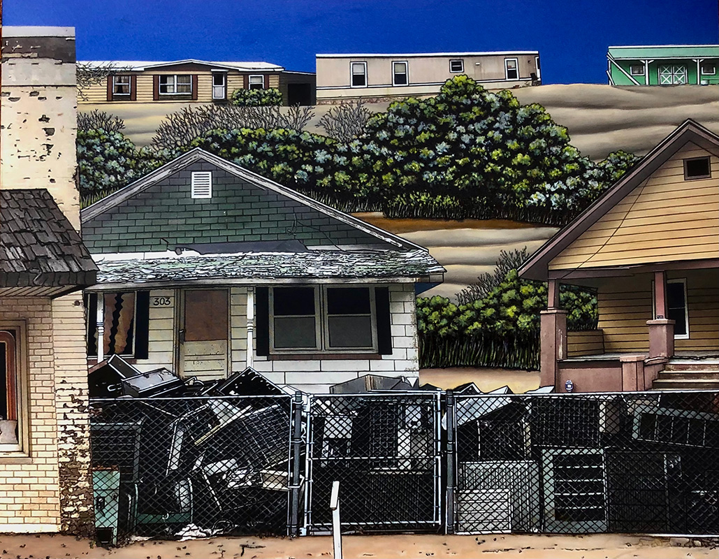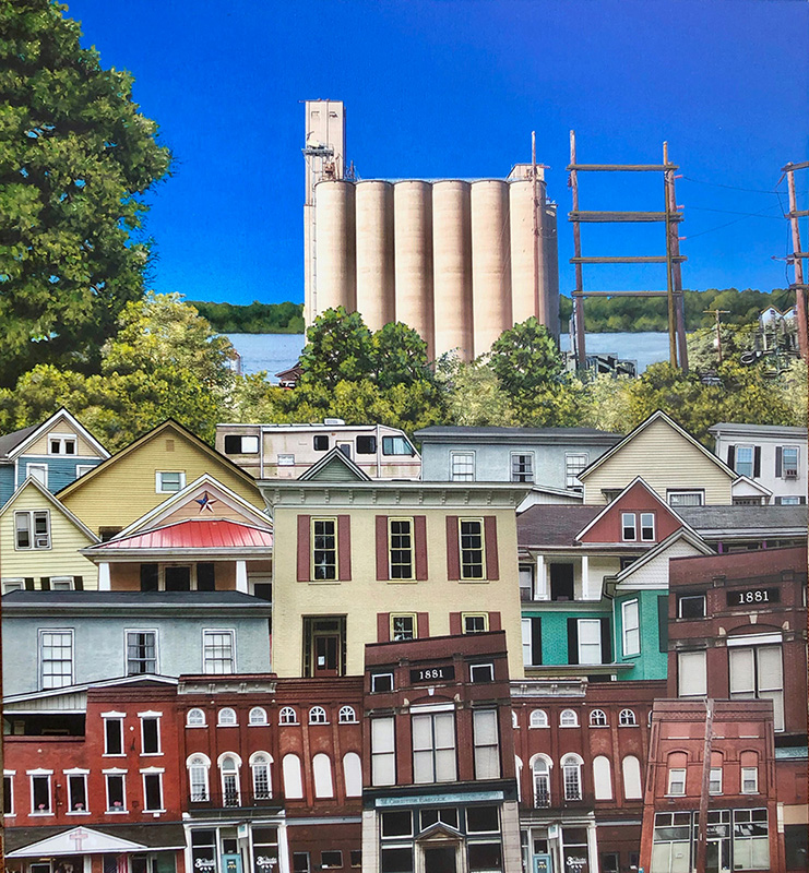 Carrier Mills IL, 2021;oil & photo transfer on canvas, 40" x 50"