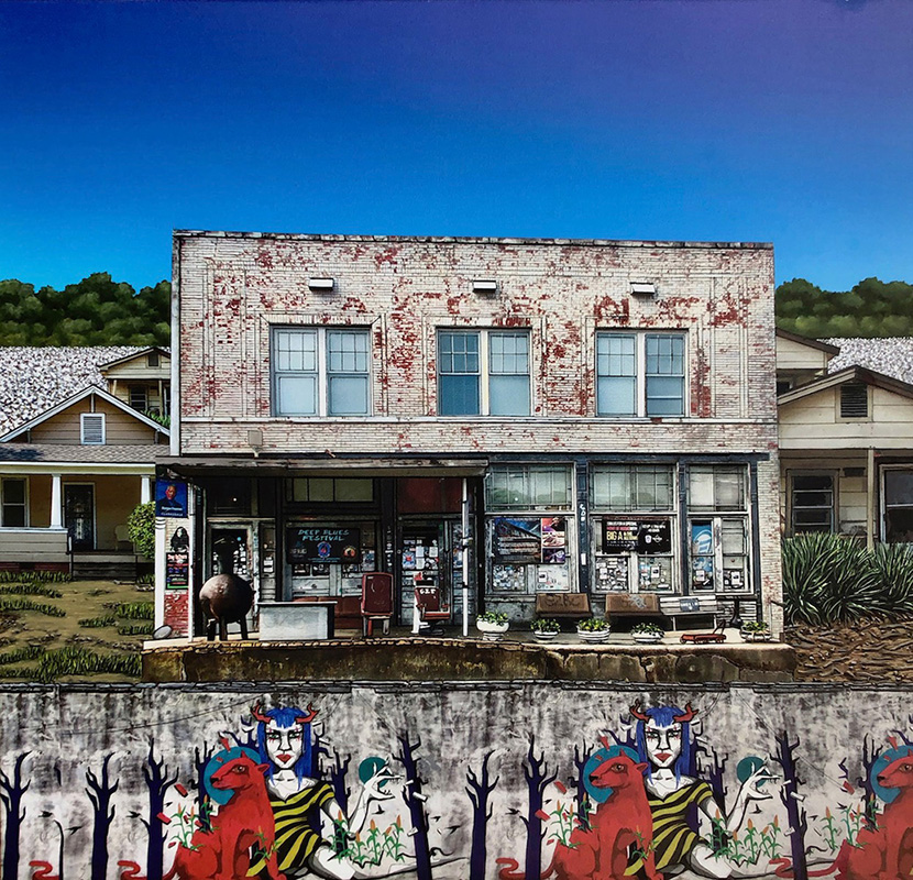 Cairo IL, Defunct Shopping Area, oil and photo transfer on canvas, 40" x 40"